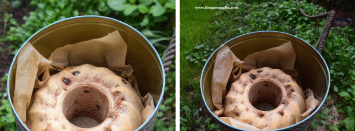 Take the dough out of the bowl, knock the air out by bashing it with your fist. Add the raisins and knead into the dough for 1-2 minutes. Grease the bundt pan with butter and sprinkle with fine-grained breadcrumbs and put in the dough. Cover it with the tea towel then leave in a warm place for 1-2 hours (or until it doubles in size).